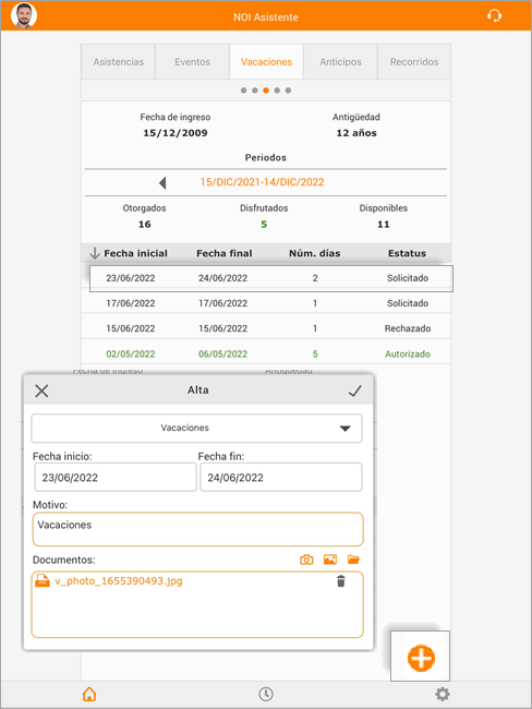 NOI Asistente Móvil / Pestaña Vacaciones / Botón Agregar