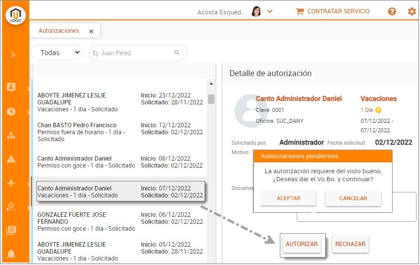 Módulo Autorizaciones / solicitudes pendientes