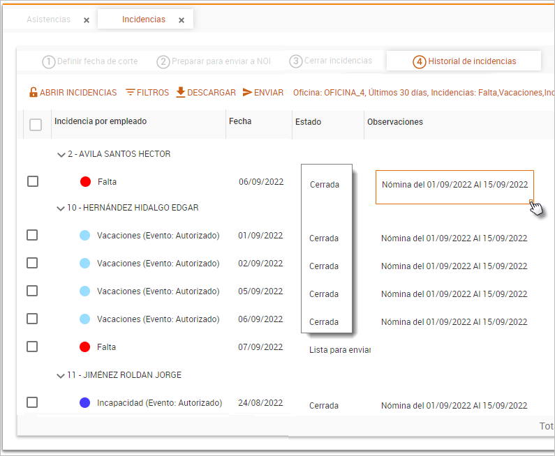 NOI Asistente Web / Incidencias / Historial de incidencias