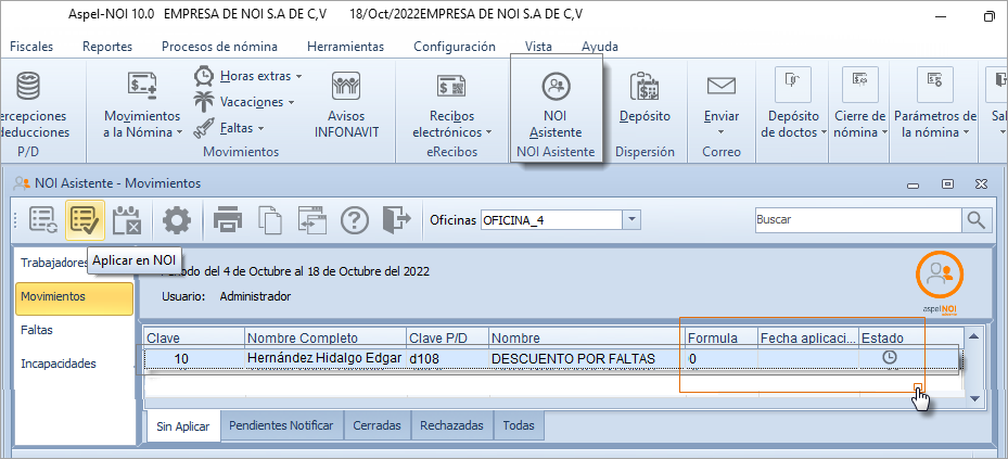 aspel NOI / Menú Nómina / NOI Asistente / Pestaña Movimientos / Seleccionar Registro / Botón Aplicar en NOI