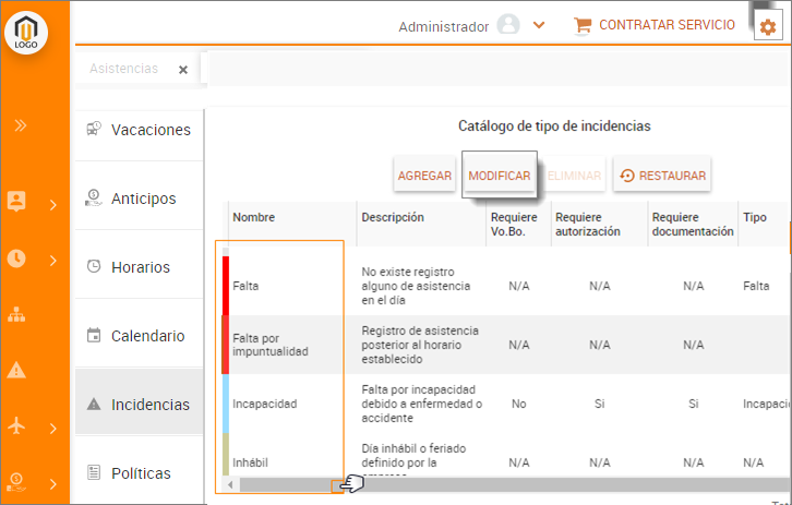 Módulo Configuración / Incidencias