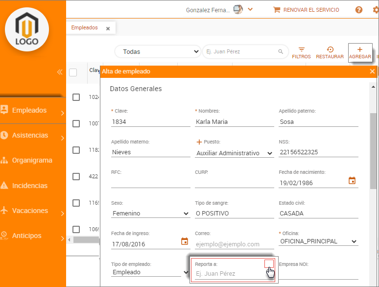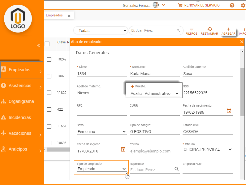 del empleado, proporciona sus datos personales y generales,
