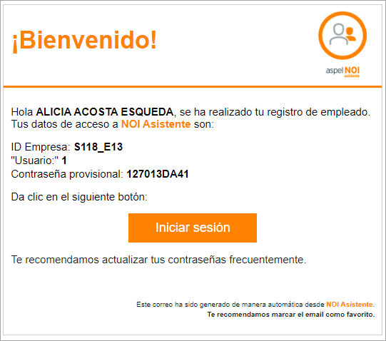 un correo electrónico, al darlo de alta en NOI Asistente